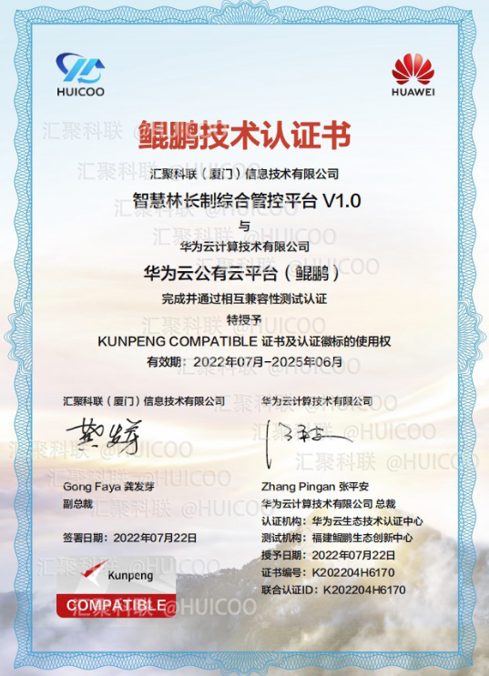 匯聚科聯(lián)自主研發(fā)的“智慧林長制綜合管控平臺(tái)1.0”與華為云計(jì)算技術(shù)有限公司的華為云公有云平臺(tái)(鯤鵬)完成并通過相互兼容性測試認(rèn)證,正式獲得華為鯤鵬技術(shù)認(rèn)證書